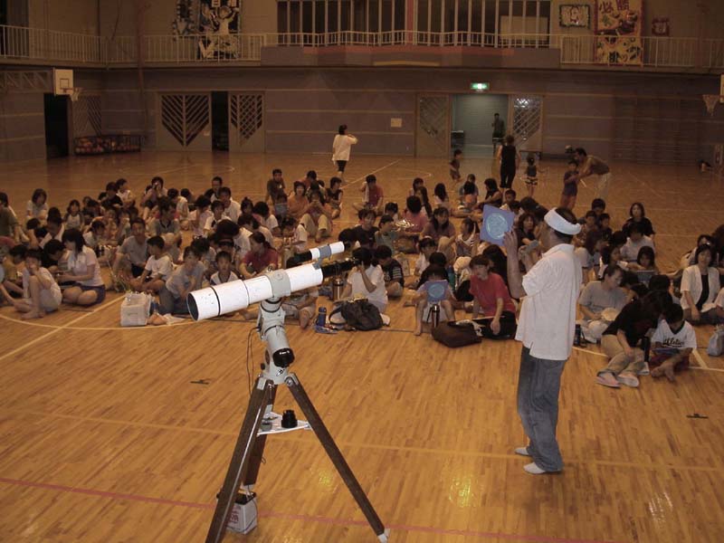 梅雨で残念ながら曇りで野外での星空教室ができませんでした。 体育館で、望遠鏡の説明・バーチャル星見・星座説明を行いました。 隕石も触ってもらったよ |