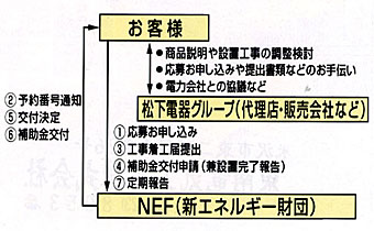 パナソニック商品は、政府補助事業『住宅用太陽光発電システム導入基盤整備 事業』適用商品です。太陽光エネルギーは地球にやさしいクリーンエネルギー として注目され、光を電力に変える太陽光発電システムを早急に普及促進させ るために、政府補助が行われる制度です。松下電気グループでは、公的補助ご 希望者の申し込手続きのお手伝いをいたします。 |